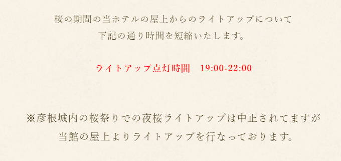 ちなみに、毎年ホテル彦根キャッスルリゾート&スパさんが有志でライトアップを行っているのですが、ライトアップは18:00~21:00まで行っています。(季節によって異なるみたいです。※2024年3月時点の情報)
